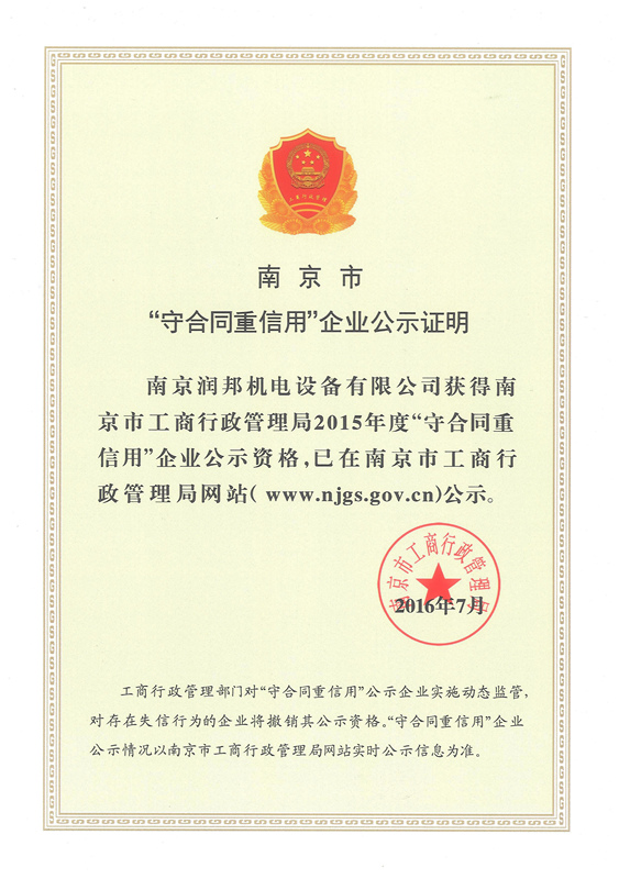 近日,接到南京市企業(yè)信用管理協(xié)會通知,我公司正式通過2015年度市級“守合同重信用”企業(yè)的認(rèn)定,并予授牌和頒發(fā)證書。
